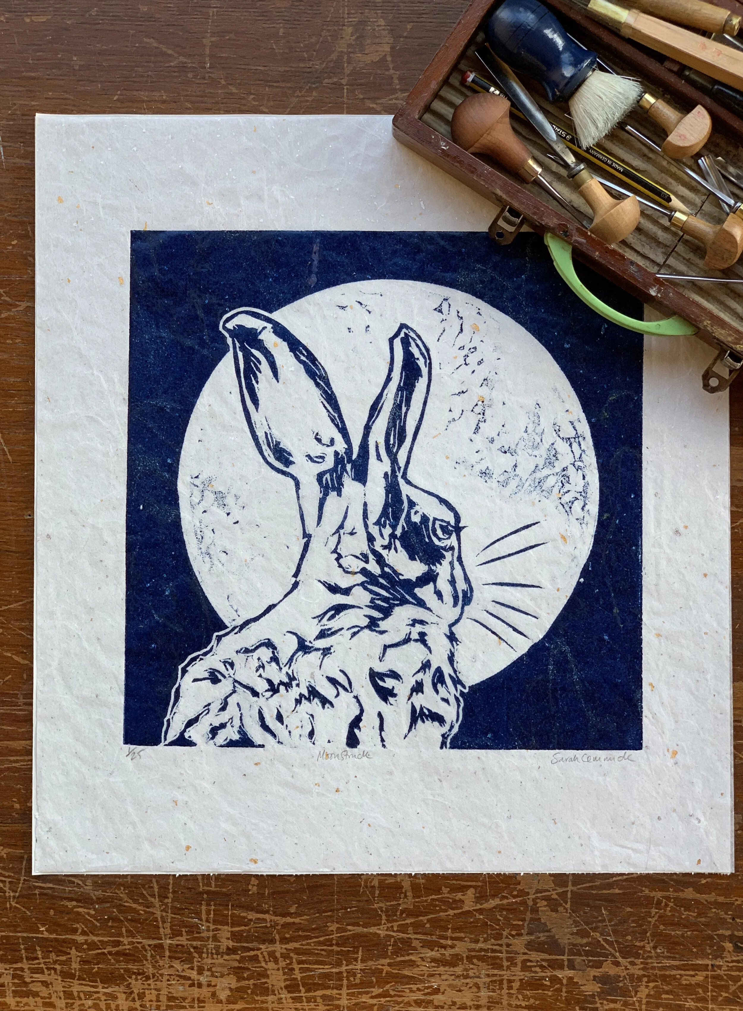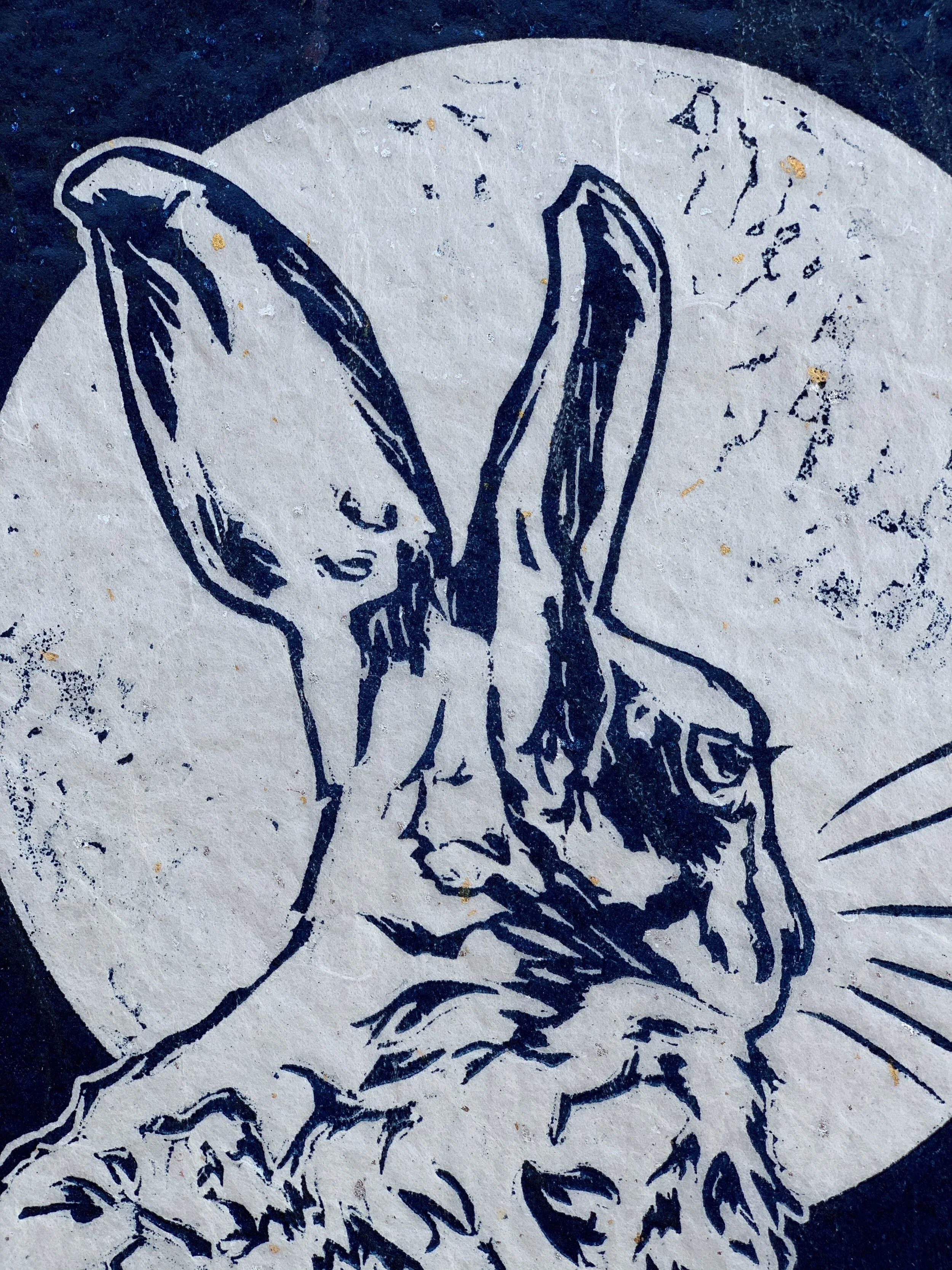 An original linocut printed on Japanese tissue with gold and silver foil flecks.
